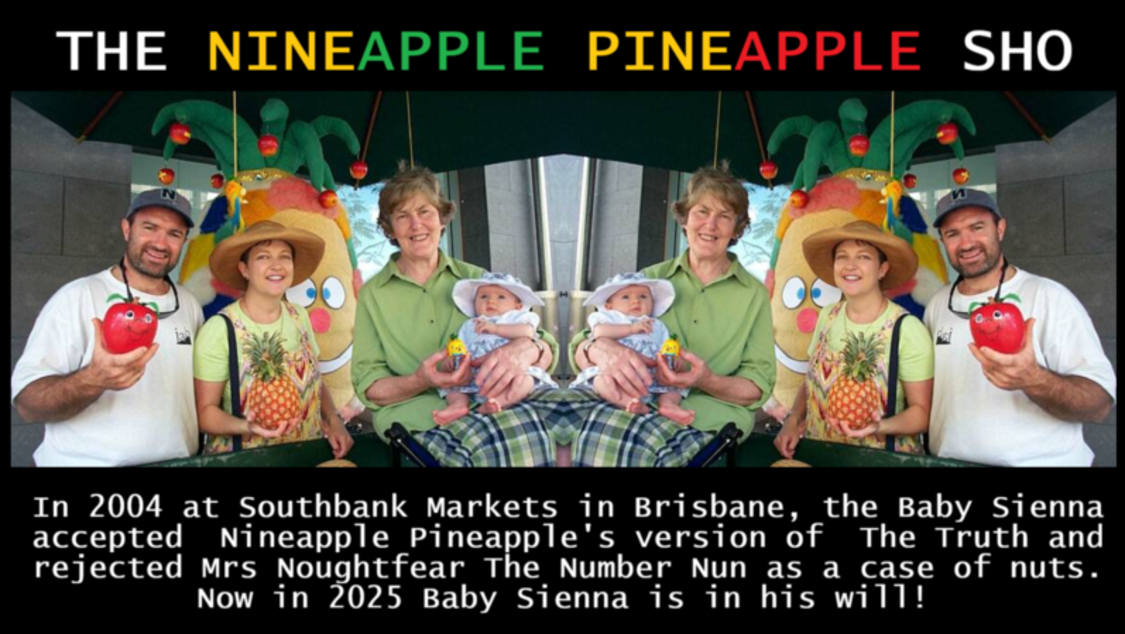 All the smarties who accepted Nineapple Pineapple over the last 33 years are now in his multi billion dollar will, and all those dummies in bed with Mrs Noughtfear the Number Nun are now in her missing well! www.gobbledygoo.com www.noughtworld.com www.dumbworld.com